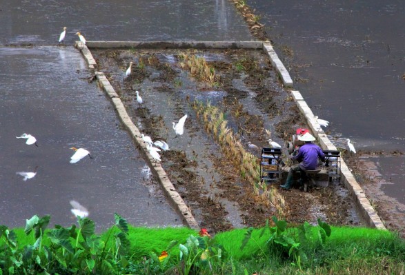 “时雨及芒种,四野皆插秧”,节令不等人,农户们邻里相帮,不时间,嫩绿的秧苗已在田间遍布开来。(蒋恩来 摄)