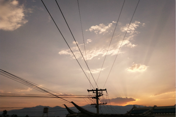傍晚,红通通的太阳就要落山了,夕阳照耀着云彩,金光四射,美不胜收。