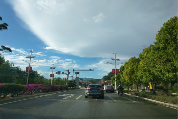 一大团云朵,好像一只巨大无比的乌龟,仿佛在和路上的车子赛跑。