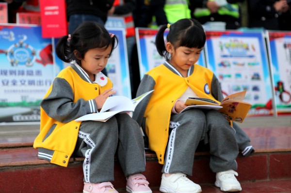 两个小朋友坐在石阶上,津津有味的翻看手中的法律法规宣传画册,感受法律的威严。