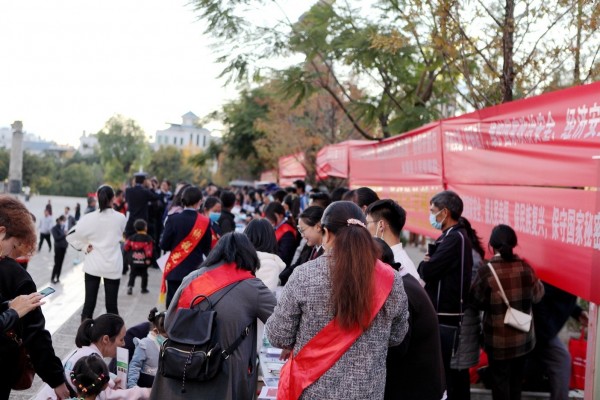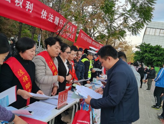 活动主场,共悬挂宣传横幅10条,设置展板10个,发放各类宣传资料3万余份,宣传折页2000册、普法作业本500本,普法环保袋500余个。按照贴近实际、贴近生活、贴近群众的要求,大力宣传宪法、民法典、十九届五中全会精神、疫情防控、预防电信诈骗、优化营商环境等法律法规及政策。