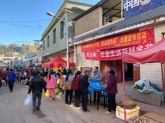 各乡镇司法所、派出所等站所也在乡镇驻地、村委会、学校等地活跃开展宣传活动,向过往群众讲解宣传法律法规知识。(沈朝熠 蒋金月 曹满芯 李正楠 摄)
