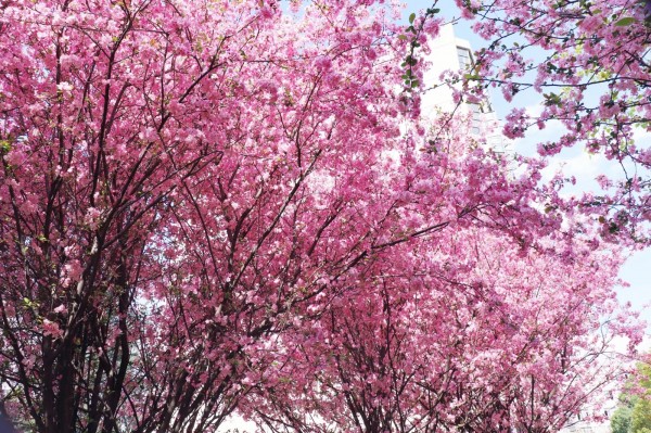 绚烂的樱花绽放枝头,层层叠叠,前推后拥,天空都被那一树树火红渲染成了亮眼的红色,春天的气息扑面而来。