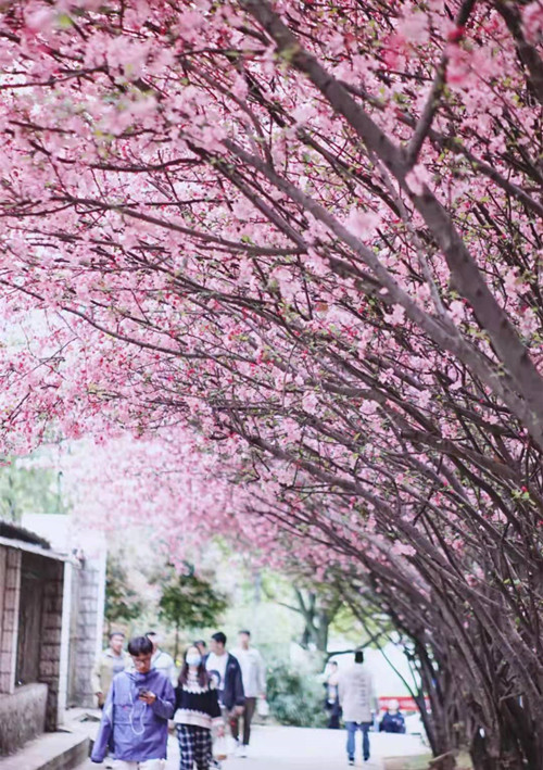 校园里的樱花开得正艳,高大的树干撑起了一路火红的樱花大道,和来来往往的青春身影构成了最靓丽的风景。