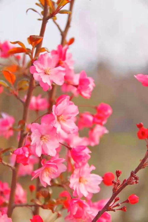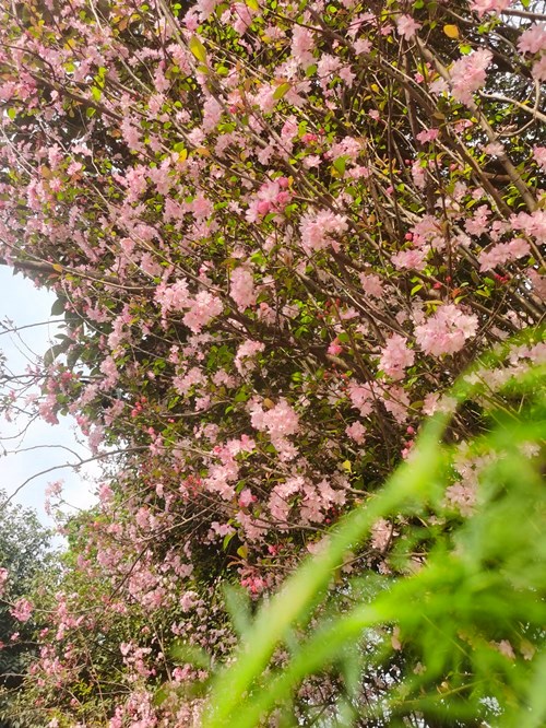 看,小小的花朵相互簇拥着,变成了一团团一簇簇粉色的大花球竞相枝头,如云似霞,鲜艳夺目,压弯了枝条。