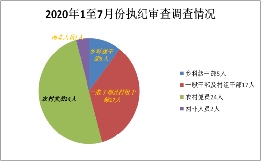 凤庆县纪检监察机关持续保持正风肃纪高压态势,2020年1至7月,共处置问题线索66件,立案审查调查44件48人。共处分乡科级干部5人,一般干部和村组干部17人,农村党员24人,两非人员2人。其中:违反组织纪律1人,违反廉洁纪律2人,违反群众纪律1人,违反工作纪律5人;职务违法5人;违反国家法律法规34人。