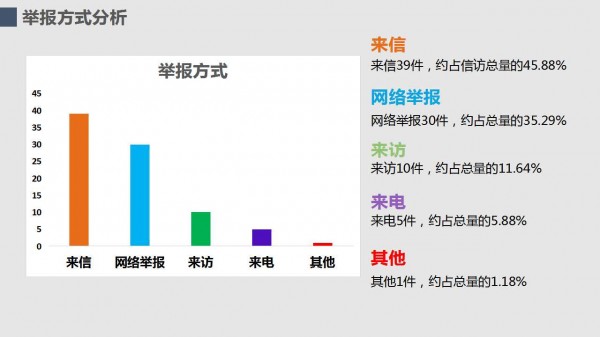 从举报方式来看,来信39件,约占信访总量的45.88%,成为接收信访举报的主要渠道;网络举报30件,约占总量的35.29%,来访10件,约占总量的11.64%;来电5件,约占总量的5.88%;其他1件,约占总量的1.18%。