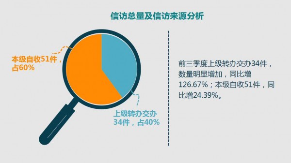 从信访来源看,前三季度上级转办交办34件,数量明显增加,同比增126.67%;本级自收51件,同比增24.39%。