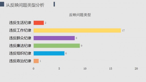 从反映问题类型来看,前三季度违反政治纪律信访件1件、违反组织纪律信访件6件、违反廉洁纪律信访件9件、违反群众纪律信访件8件、违反工作纪律信访件17件、违反生活纪律信访件2件,职务违法犯罪行为信访件9件,其他违法犯罪行为信访件9件。(陈松林 肖红兰)