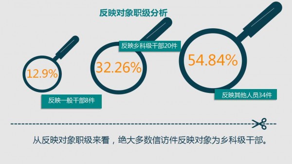 从反映对象职级来看,绝大多数信访件反映对象为乡科级干部,前三季度反映乡科级干部20件,占总量的32.26%;反映一般干部8件,约占总量的12.90%; 反映其他人员的34件,约占总量的54.84%。