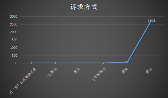 从诉求方式来看,村(居)民监督委员会1件占0.04%,手机短信1件占0.04%,来信3件占0.1%,下访和约访7件占0.24%,来电80件占2.81%,来访2752件占96.77%。