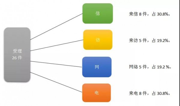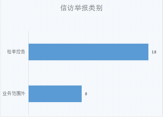 从信访举报类别看,检举控告类18件,占69.2%;业务范围外8件,占30.8%。