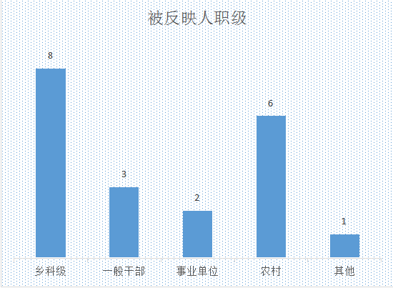 从被反映人职级看,反映乡科级和农村干部比较突出。其中,反映乡科级8人,占40%;一般干部3人,占15%;事业单位2人,占10%;农村6人,占30%;其他1人,占5%。(李秋瑾)