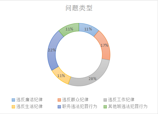 从各类违纪违法行为看,违反廉洁纪律2件,占11%;违反群众纪律3件,占17%;违反工作纪律5件,占28%;违反生活纪律2件,占11%;职务违法犯罪行为4件,占22%;其他违法犯罪行为2件,占11%。
