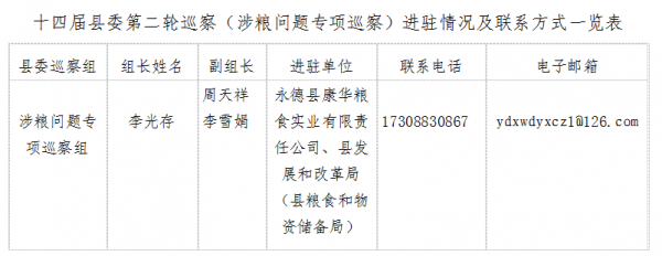 县委涉粮问题专项巡察组组长李光存强调,开展涉粮问题专项巡察,是对被巡察党组织履行涉粮工作职能责任的政治监督。县委专项巡察组将充分发挥标本兼治战略作用,紧扣被巡察党组织职能责任,紧盯领导班子和“关键少数”,特别是“一把手”,深入查找政治偏差,从推动查处涉粮领域失职失责及腐败和作风问题入手,剖析背后的根源、规律,以巡促改、以巡促建、以巡促治,督促永德县康华粮食实业有限责任公司、县发展和改革局(县粮食和物资储备局)和广大党员干部增强“四个意识”、坚定“四个自信”、做到“两个维护”,认真贯彻落实习近平总书记关于保证粮食安全、加强粮库监管、惩治涉粮腐败等重要指示批示精神,认真执行党中央关于粮食安全重要决策部署和省委、市委、县委工作要求,进一步健全我县粮食购销领域的管理体制机制,提升治理能力和治理水平,坚决维护国家粮食安全。