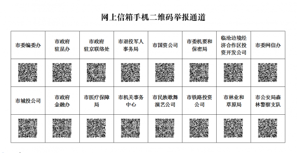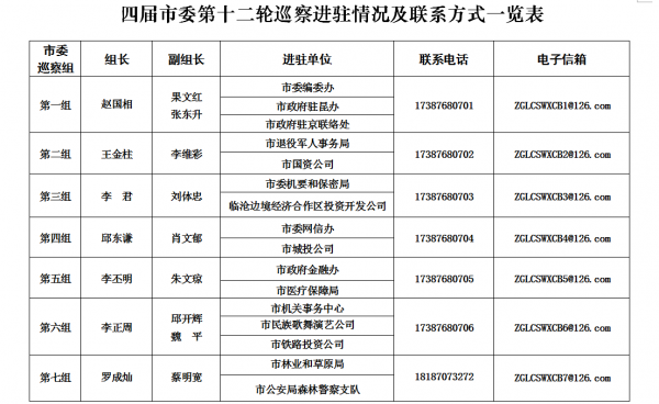 巡察期间,设信访接待点:临沧市委党校书山苑1栋;举报信邮寄地址:南屏西路101号市委巡察办转,邮编:677000;开通手机二维码网上信箱举报;来电、来访时间为08:30—18:00。同时,为便于干部群众直接投放信件,在临沧市委党校书山苑1栋一楼大厅门口以及被巡察单位办公楼前设立联系信箱。欢迎广大党员干部群众向市委巡察组反映问题、提供领导干部违纪违规问题线索。