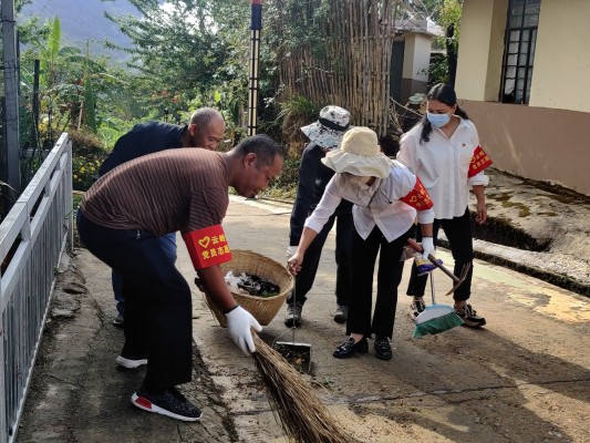 纪检监察干部们带上锄头和扫帚带头开展提升人居环境行动,清扫村组道路、清理路边垃圾、杂草。