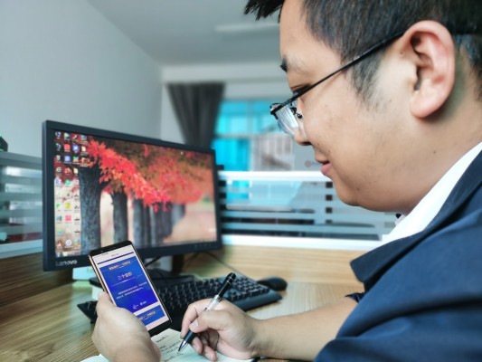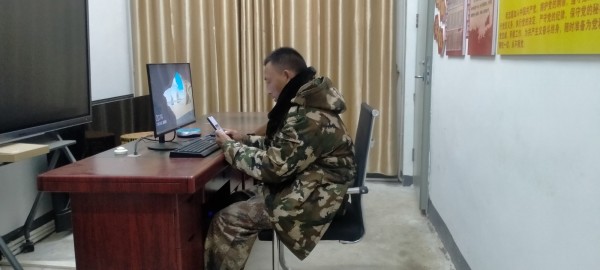 在炮楼山抵边联防所执勤的南伞镇大营盘村村务监督委员会主任张志成用手机学习省党代会精神