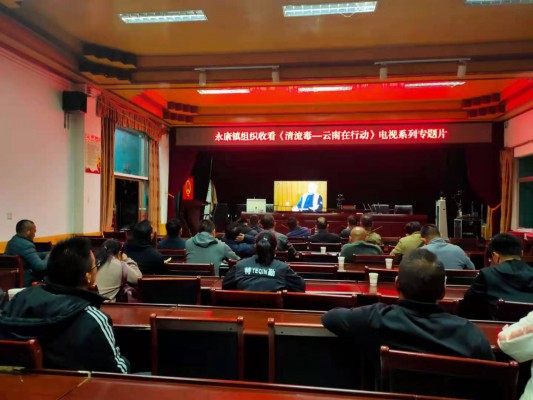 永康镇以集中观看与自行观看相结合的方式,由镇党政办公室通知至各村、各站所组织全镇干部职工观看《清流毒—云南在行动》第二集。图为永康镇组织干部职工在镇会议室集中观看。