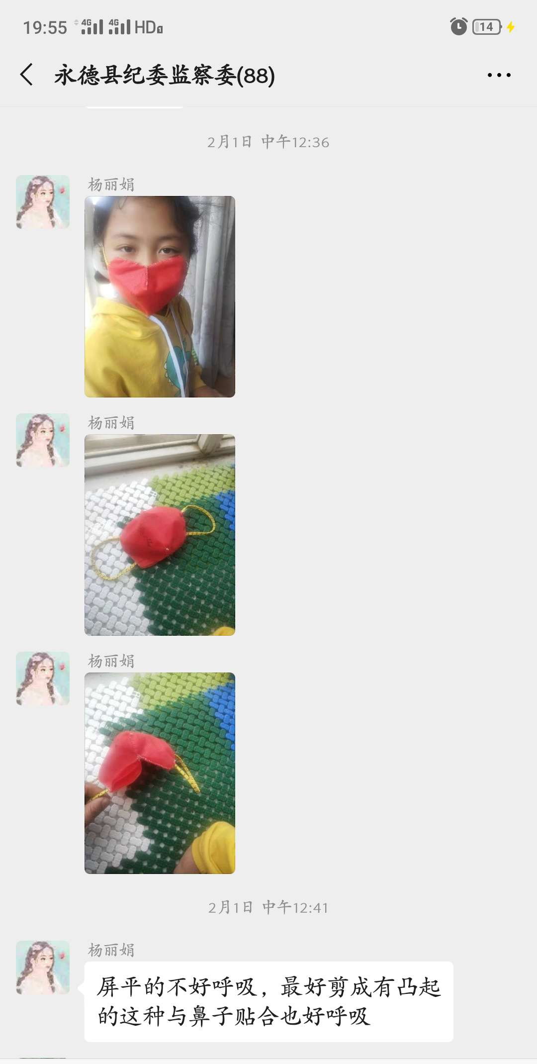 新型冠状病毒感染的肺炎疫情爆发以来,口罩成了紧缺物资,在得知在一线开展工作的同事们口罩紧缺以后,县监委委员杨丽娟便在微信群里上传了她亲手缝制口罩的步骤,工作雷厉风行“女汉子”也丝毫掩盖不了她心灵手巧的细腻和对一线同事们的牵挂。