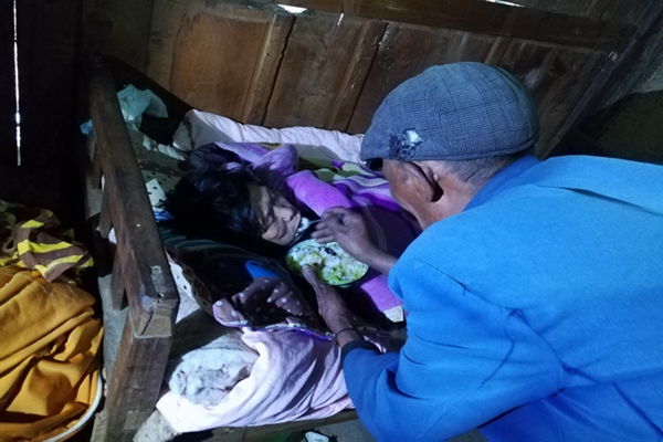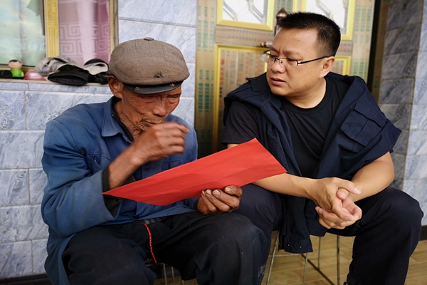 当老人得知驻村工作队为他筹到的2000元善款及轮椅时,老人双手抱着这“巨款”,用激动而颤抖声音说道:“我年纪大了,什么事都做不了了,谢谢共产党,谢谢你们工作队……”,话音未落,他就用手抹着眼泪,哽咽了起来……