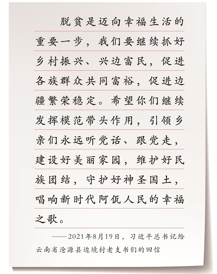“读了来信,了解到脱贫攻坚给阿佤山带来的深刻变化,感受到了阿佤人民心向党、心向国家的真挚感情,我很欣慰。”2021年8月19日,习近平总书记回信勉励云南省沧源县边境村的老支书们,并提出殷切期望。