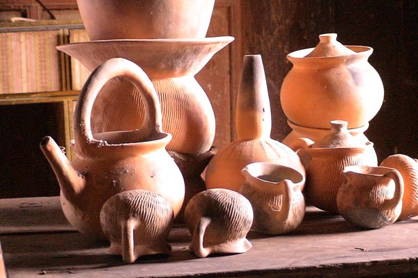 陶制品有锅、甑、罐、瓶、炒茶锅、薄壁风炉等。泥胎用拍板拍打圆正、殷实后,用竹签或木模戳压出图案简单、朴素的为圈、为点、为线花纹。