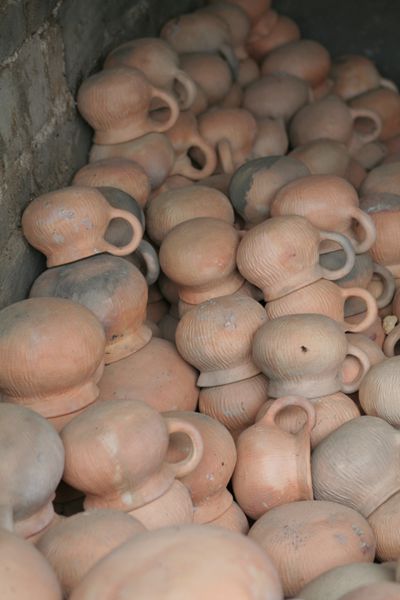 成型后阴干,再用火烧——先以草灰铺地,再将泥胎置放其上,大件套小件,一摞摞装好后,再横向放置,一层层堆码稳妥,之后用稻草盖严,再满堆细干柴,点火烧燎,一气呵成,不能中断,以防水汽外逸,致使器物炸裂报废。烧两小时左右,停止烧火,让器物自然冷却,即出成品。一般是傍晚点火,次日早晨出成品。
