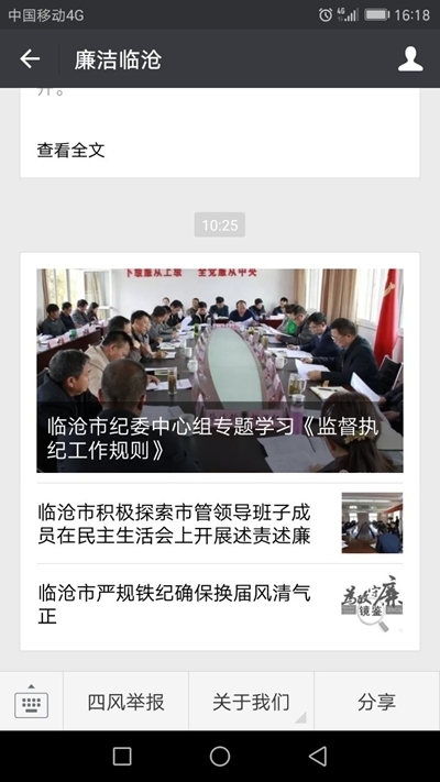 “廉洁临沧”微信公众平台,设置了“四风举报”“公示公告”“监督执纪”“廉政文化”“理论指导”等栏目,综合运用文字、图片、视频等多种形式,第一时间刊发中央、省、市、县纪检监察工作动态,及时发布廉政新规、廉政提醒、廉政新闻、廉政告知等内容。通过廉洁宣传教育,努力营造以廉为荣、以贪为耻、风清气正的政治生态环境,传导正风反腐正能量,推进实现廉政宣传教育广覆盖、常态化。同时,微信公众平台设有“四风举报”等内容,并开发了专门的后台,由市纪委相关部门专人管理,积极回应社会关切。公众号信息发布严格遵守层级审批制度,由市纪委宣传部专人负责运行维护。