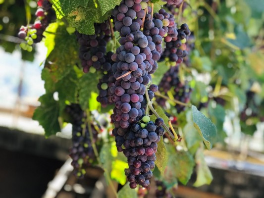 从夏天的绿,到秋天的紫,葡萄架上挂满了大串大串的紫色珍珠,甚是诱人。真的是应了那句谚语:“立秋温度高,果子着色好。”(陈媛媛 摄)