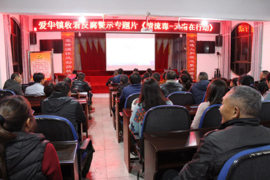云县爱华镇组织干部职工集中收看反腐警示专题片《清流毒——云南在行动》第三集。