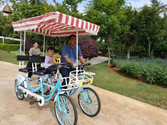 带着孩子在公园里骑行,沐浴大自然的阳光,感受和体验大自然带来的美好。
