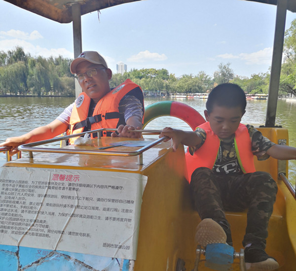 阳光明媚的下午,父子两泛舟湖上,温暖的阳光照耀着大地,一阵阵凉爽的微风掠过水面,格外惬意。