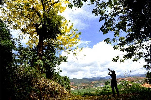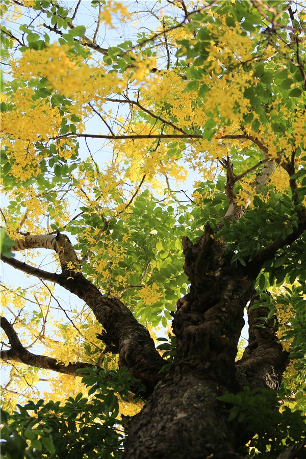 “腊肠树”双江当地称“仙人肠子花”,是双江众多奇异物种中的一种,常见于傣族或布朗族村落。仙人肠子花属落叶小乔木或中等乔木,高可达15米,初夏开花,满树金黄,秋日果荚长垂如腊肠,为珍奇观赏树,被广泛应用在林园绿化中,自成一景。花期在5至6月,每当花开时节,花絮随风摇曳,花瓣随风如雨落,所以又名“黄金雨”。