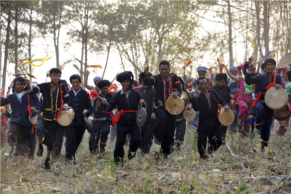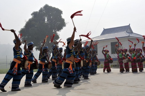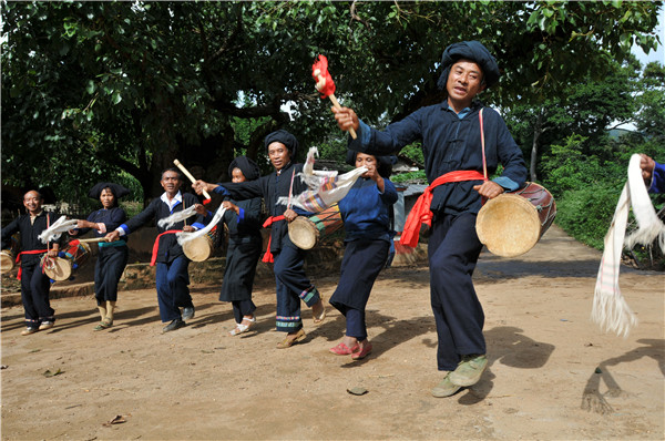 蜂桶鼓源于它的形状像布朗族养蜂的蜂桶而得名。蜂桶鼓舞属布朗族的群众性舞蹈。演出时,由两名年轻女子双手各持一条“帕节”(即毛巾)在前面跳“帕节舞”引导,其后是蜂桶鼓队,一般为4—6只,后紧随2只象脚鼓,之后是6人敲打的大、中、小芒和镲。蜂桶鼓舞的节奏明快热烈,动作大方粗犷而不失轻盈细腻,每逢“插花节”等传统节日,布朗族群众都会跳起蜂桶鼓舞庆祝节日的到来。2009年,布朗族“蜂桶鼓舞”被命名为国家级非物质文化遗产保护名目。 (江宏峰)