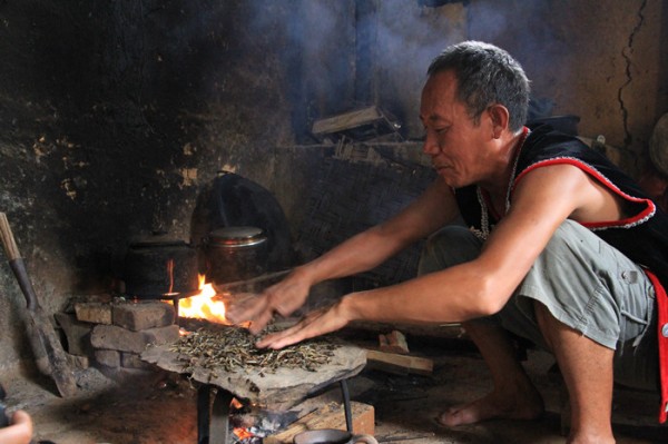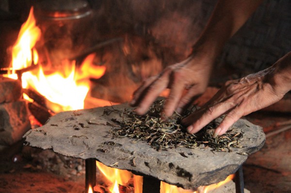 “石板烤茶”是双江阿佤人世代沿袭的一道待客茶饮,它泡制简捷,工序简单,其味独特,用料较少,是一道地道的佤族家常茶饮。其制作过程为,取一青石板置于火塘上烘烤(预热),待石板发热发烫,将晒青毛茶放于石板上备烤,用手不停地翻炒,待晒青毛茶发出浓烈的茶香味时将其取下,放入预先烘烤预热的茶罐之中,再度烘烤,使之晒青毛茶再次发出浓郁的茶香味时,倒入沸水,稍煮片刻,将头道茶水稍稍倾出茶罐洒于地上(预示祭奠祖先,让其神灵先饮),随后将余茶倒入茶具进行调制,依次倒入茶杯,就可以饮用了。有时根据需要,也会在烘烤时加入适量“三七”花叶等中药材。其味甘苦回甜,香气浓郁,具有健胃、解渴、提神之功效,是一道极具佤族特色的待客礼仪茶饮。