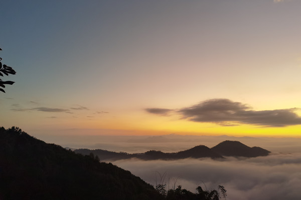 初霞映照下云海层层叠叠漂浮在山间,光芒渐渐地拉开了巨大的帷幕,云开始翻涌起来,豪迈壮阔。(高巍和 摄)