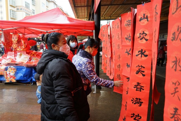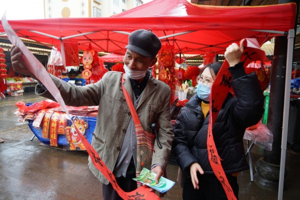 群众高兴的接过春联,仔细品读,笑脸盈盈。