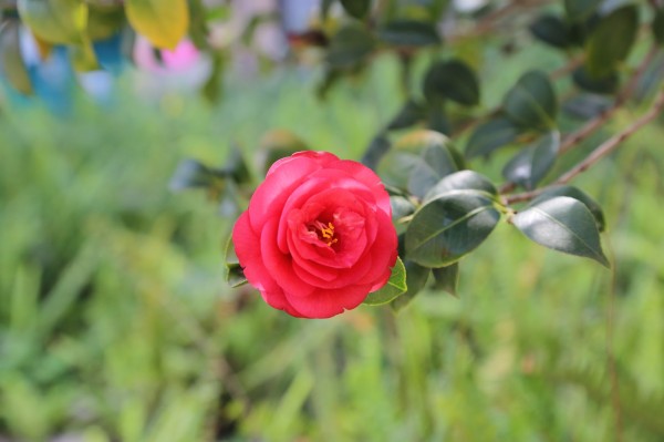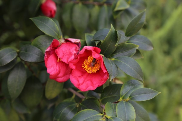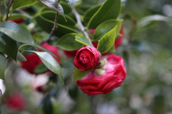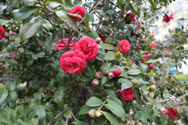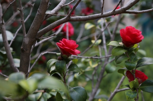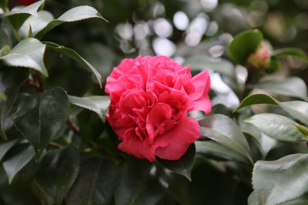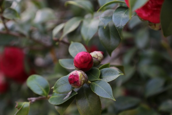 山茶开花于冬春之际,花姿丰盈,端庄高雅,是中国传统十大名花之一,也是世界名花之一。郭沫若盛赞曰:“茶花一树早桃红,百朵彤云啸傲中。”山茶花,既具有“唯有山茶殊耐久,独能深月占春风”的傲梅风骨,又有“花繁艳红,深夺晓霞”的凌牡丹之鲜艳。(陈媛媛)