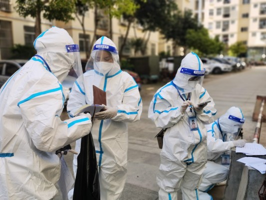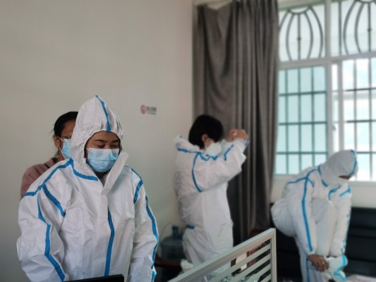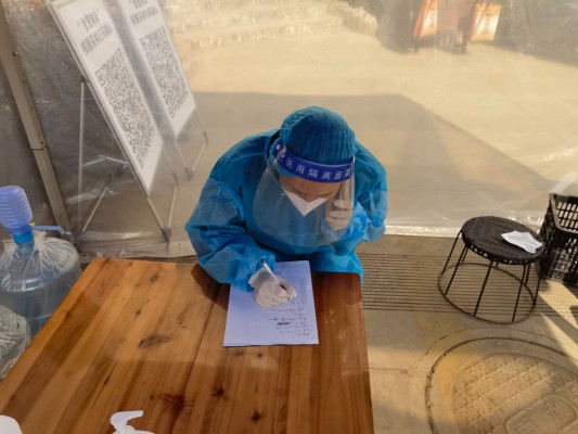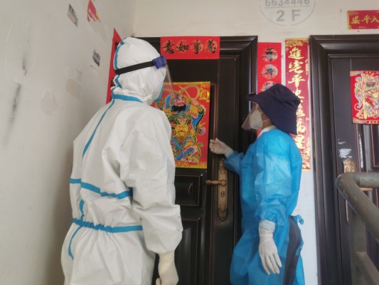 配合医务人员上门为住户进行核酸采集。(罗永琴 摄)