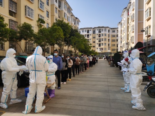 积极参与维护核酸检测现场秩序。(林丽波 摄)