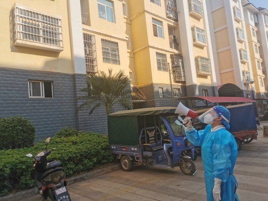 提醒住户有序参加核酸检测。(罗永琴 摄)