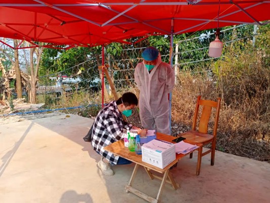 图为县委常委、县纪委书记、县监委主任杨枝一行到孟定镇芒艾村委会,对卡点人员车辆管控、村组全员核酸检测等重点环节进行监督检查。