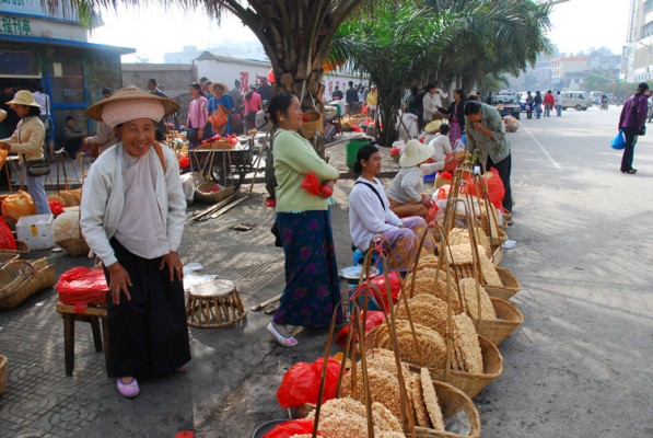 勤劳聪明的傣族妇女到集市出售自制食品“烤崩”
