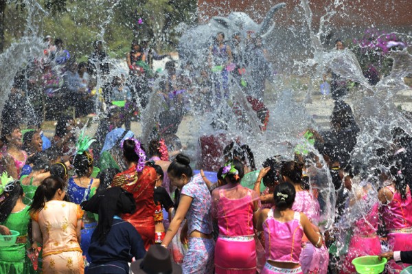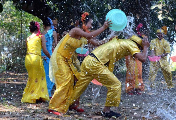 泼水节是傣族最隆重的节日,也是双江少数民族节日中影响面大,参加人数最多的节日。泼水节是傣历新年,一般在“清明”后十天,相当于公历的四月中旬,具体的日子要由熟悉傣历的高僧推算。节前一天傣语叫“过必高”,意为辞岁,相当于汉族的除夕,节日一般持续3至7天。节前,傣族家家做米花(“烤崩”)、炸粑粑、打扫庭院、缝制新衣、置办酒肉、邀请客人。节日期间主要有堆沙、赛鼓、遛包、放火花(烟花)、串寨等活动。节日第一天傣语叫“比磨善罕”,人们把这一天视为最美好,最吉祥的日子。节日清晨,傣族男女老少就穿上节日盛装,挑着清水,先到佛寺浴佛,然后就开始互相泼水,互祝吉祥、幸福、健康。人们一边翩翩起舞,一边呼喊“水!水!水!”,鼓锣之声响彻云霄,祝福的水花到处飞溅,场面十分壮观。(注:本文图片均为2021年前拍摄。)( 江宏峰)