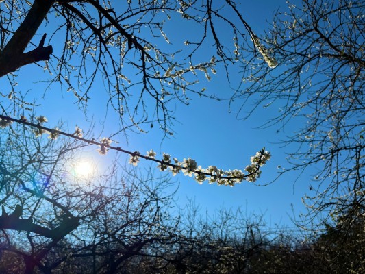 村口那棵梨树上绽放的花瓣犹如万千飞碟,在蓝天下飞扬着蹁跹的舞姿,呼吸着春天的润泽。(陈溪莲 李朝雁 段学琴)