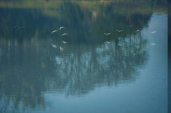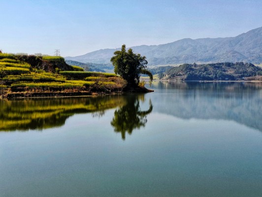 晨雾中的村庄,碧水倒影,春意盎然,生机勃勃。