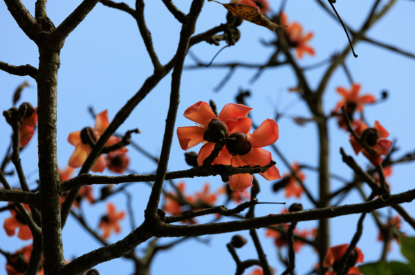 惊蛰一到,木棉花开到盛处,光秃秃的树枝上,一朵朵鲜艳红硕的大花以鲜红似火的姿态,傲然挺立于枝头,染红了春天。木棉花又名“英雄花”,花朵红艳但不媚俗,火红的花朵一朵朵、一簇簇,就像英雄的鲜血染红了树梢,在蓝天白云的映衬下显得格外耀眼夺目,让人不胜留恋。图为沧源县勐来村盛开的木棉花缀满枝头。(阳益民 摄)