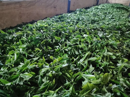 萎凋:在一定的温度、湿度条件下均匀摊放,使适度促进鲜叶酶的活性,内含物质发生适度物理、化学变化,散发部分水分,使茎、叶萎蔫,色泽暗绿,青草气散失。