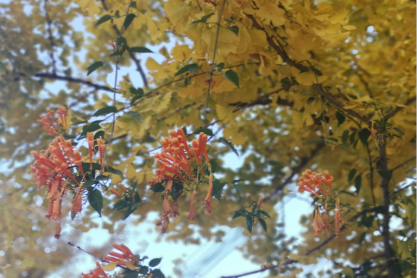 叶子和花朵在阳光下低语,为深秋增添了一抹亮色。(陈溪莲 摄)